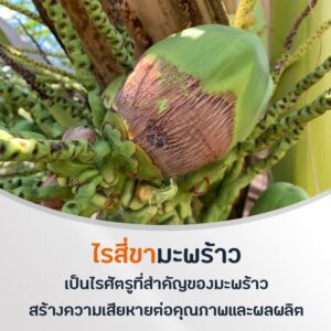 ไรสี่ขามะพร้าว (Coconut Mite) เป็นไรศัตรูที่สำคัญของมะพร้าว สร้างความเสียหายต่อคุณภาพและผลผลิต ไรสี่ขามะพร้าวอาศัยอยู่ใต้กลีบเลี้ยงของผลมะพร้าว ไม่สาม...